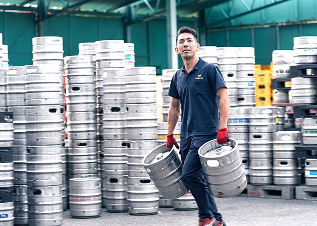 名畑は1936年創業、関西エリアを中心に9,500店舗以上の飲食店様とお取引している専門商社です。お酒だけでなく、飲料、食材、資材など20,000品目以上を取り扱い、飲食店様のご繁盛をチームでサポートしています。コロナ禍で売上が58%まで落ち込みましたが、V字回復を遂げ、現在はコロナ前の118%の売上を達成。困難を乗り越えた強い組織力が自慢です。